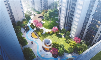 社区内部,项目跳脱出老城区的空间局限,以约1.8万平方米的立体园林构建垂直生长的公园型社区,打造有500平方米星光泳池、400米健身有氧跑道、健身区、儿童乐园、老年广场等功能空间,让社区变成全龄友好生活主场。