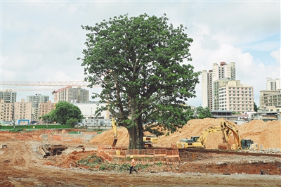 在海建·凤翔豪庭热火朝天的施工现场,一棵高达30米、围径5.8米的猴面包树格外引人注目。