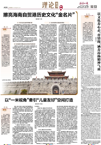 ■ 谭超平 党斯海南的历史文化,承载着黎苗风情、南洋印记、海洋文明、琼崖精神与改革开放精神等,是中华文化在南海之滨生生不息的见证。习近平总书记嘱托海南,“把海南自由贸易港打造成展示中国风范的靓丽名片。”加强历史文化保护传承,正是海南践行殷切嘱托,为自贸港建设注入深厚人文底蕴的重要举措,必须以更高的政治站位、更强的历史自觉、更实的协同举措,将历史文化保护传承全面融入海南发展大局,擦亮海南自贸港的历史文化“金名片”。