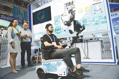 在第九届丝绸之路国际博览会暨中国东西部合作与投资贸易洽谈会省际合作展上海市展区,工作人员演示脑控康复轮椅。