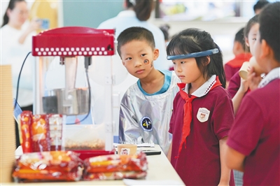 在长沙市天心区仰天湖实验学校,学生在科技节上体验“脑控爆米花”。 新华社发