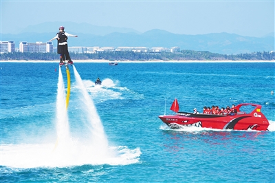 1月8日,三亚蜈支洲岛景区,游客正在体验水上运动项目。
