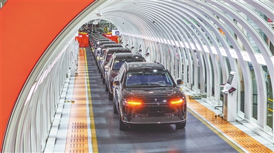 在重庆市两江新区的赛力斯汽车超级工厂拍摄的即将下线的新能源汽车。 新华社发