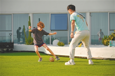1月17日,海南三亚大东海附近的珠江花园酒店,服务员教外籍旅客体验中国蹴踘游戏。海南日报全媒体记者 王程龙 摄