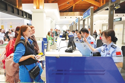 1月1日凌晨,来自俄罗斯符拉迪沃斯托克的SU856次航班搭载155名旅客平稳降落三亚凤凰国际机场,凤凰边检站民警正为境外游客办理入境手续。海南日报全媒体记者 王程龙 通讯员 卓安洋 摄