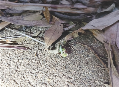 2023年7月,昆虫爱好者杨梓煊和师兄在黎母山进行野外研究采样,有一天他们在山上“刷夜”,走在海拔六七百米的一条雨林岔路上时,偶遇了一只趴在灌木叶片上“睡觉”的蜢科昆虫雌虫。“当时就觉得这只小虫子很特别,是个‘潜力股’,特意多留了个心眼。”杨梓煊回忆。