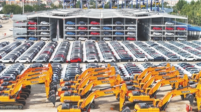 国产汽车和工程机械在山东港口烟台港集结等待装船出口。 新华社发
