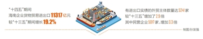 经营主体活力迸发,民营企业成外贸主力军。“十四五”期间,海南货物贸易主体数量持续攀升,有进出口实绩的外贸主体数量达5241家,较“十三五”增加了2.9倍。其中,民营企业5017家,增加3.3倍;进出口6706.9亿元,增长32.9%,占全省进出口总额的59.3%,所占比重较“十三五”提升了34.1个百分点。