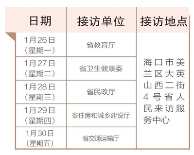 1月26日至30日,省教育厅、省卫生健康委、省民政厅、省住房和城乡建设厅、省交通运输厅相关负责人将在海口市美兰区大英山西二街4号省人民来访服务中心接访群众。