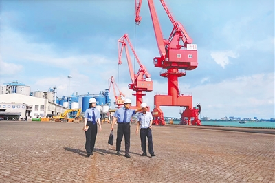 洋浦检察院干警到国投洋浦港码头为集装箱装卸业务提供检察服务。