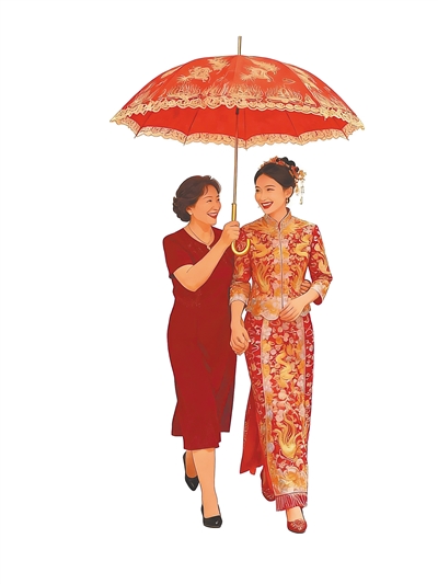 婚礼是人一生中最重要的仪式之一,海南各地婚俗中有不少讨彩头的环节。定安等地的新娘出嫁时,由一名伴娘打红伞护送,红伞象征着喜庆和吉祥,也有遮风挡雨、一生周全的寓意。在海口羊山地区,新娘一般由一位全福长辈(指父母、配偶、子女都有)打伞护送进门。