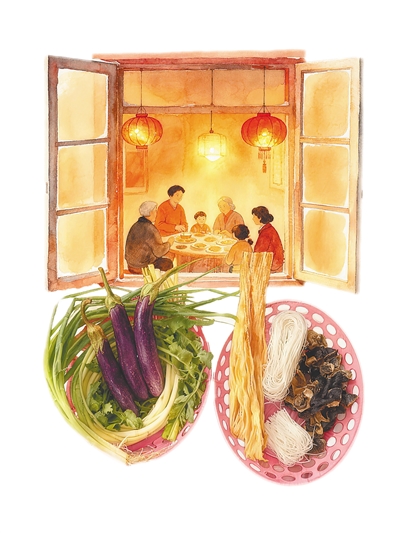 斋菜煲是海口人大年初一必吃的美食。其食材常选用水芹、甜菜、豆芽、发菜、粉丝、黄豆腐干、紫茄或西红柿、青蒜、荞头、香菇、黑木耳、花生、腐竹等(通常选其中12种或10种)。这些食材均有好寓意,比如发菜谐音“发财”,腐竹谐音“富足”,等等。陵水人也吃斋菜煲,但食材与海口的斋菜煲略有区别。陵水版斋菜煲的食材通常为南瓜、黄花菜(干)、花生、蔓薯(紫)、粉丝、上架豆(多选紫扁豆)、紫茄、腐竹共8种。花生也被称为“长生果”,寓意健康长寿;茄子和荞头在海南话中谐音“较”,寓意一年更比一年好;上架豆象征着事业成功、家庭运势上升;黄花菜色泽金黄,寓意金玉满堂;南瓜象征丰收,在海南话中念作“合瓜”,因而又有家庭和睦的寓意。