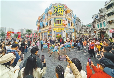 街区内,一场充满海南特色的快闪表演火热上演。表演者身着花短裤、头戴特色斗笠,活力十足的舞姿吸引众多游客驻足围观,大家纷纷举起手机记录精彩瞬间。海南日报全媒体记者 王程龙 摄