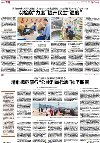 民生无小事,枝叶总关情。海南检察机关将持续把百姓“急难愁盼”转化为检察“履职清单”,在食药、社保、医疗、养老、住房、环保等领域持续发力,做实群众信访件件有回复、司法救助、支持起诉等制度,为妇幼、老年、残疾、农民工等群体撑起法治晴空,用一场场“检护民生”的生动实践,把法治温度送进千家万户。(撰文/悦光 供图/海南省检察院)