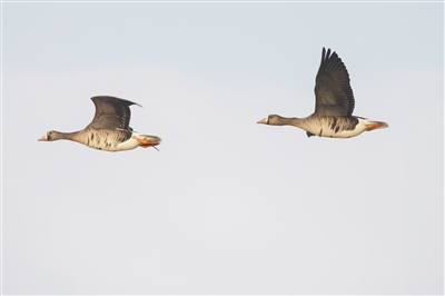 白额雁在东方黑脸琵鹭省级自然保护区飞翔。 吕树天 摄