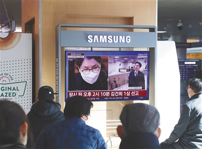 图为韩国民众在首尔火车站观看金建希的新闻。新华社发