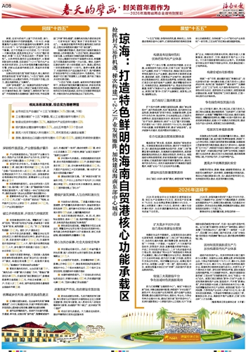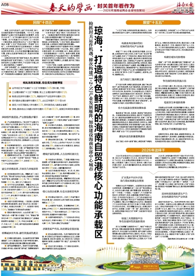 扩大医疗消费,做精乐城医旅品牌,推动“享全球医疗”;提升免税消费,形成“离岛免税、岛内居民日消品免税、跨境电商”多层次供给;发展教育消费,延伸中外合作办学、培训研学、文化体验等业态;打造多元消费热点,鼓励发展首发经济、银发经济、夜间经济、“谷子”经济、票根经济;做好“十五五”重大项目储备,初步谋划146个项目、总投资约1184亿元;深化要素市场化配置、财政管理等改革,建设“诚信琼海”。坚决破除卡点堵点,促进民营经济发展壮大。