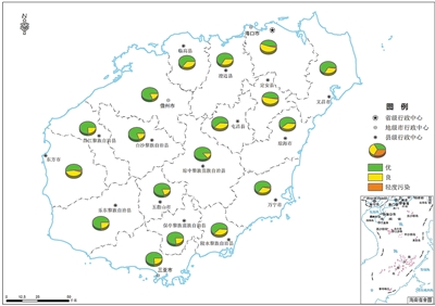 全省环境空气质量总体优良,优良天数比例为99.0%,同比上升1.5个百分点。其中,优级天数比例为69.3%,良级天数比例为29.7%,轻度污染天数比例为1.0%,无中度污染及以上污染天。各市县环境空气优良天数比例范围为95.7%~100%。