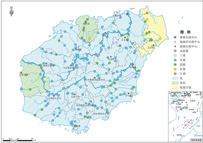 全省地表水水质总体为优,192个1省控监测断面(点位)水质达到或好于Ⅲ类比例为95.8%,同比下降1.1个百分点;无劣Ⅴ类断面,同比持平。19个市县中,文昌市水质轻度污染,东方市、临高县水质良好,其余市县水质为优。