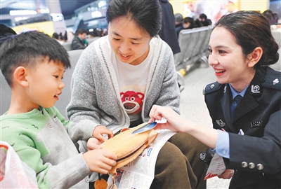 1月30日,在乌鲁木齐铁路公安处举办的“新疆铁警‘警馕’妙计 助您平安回家”安全出行宣传活动中,民警将内置有安全出行卡片的文创产品送给参与活动的旅客。新华社发