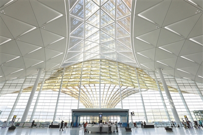 “智慧”服务方面,设置自助行李托运系统和自助值机系统,提高旅客值机效率,应用One ID平台实现“无纸化”出行,切实提升旅客出行效率;“人文”机场方面,T3航站楼建筑及装饰风格设计以《诗经》中的“凤凰于飞”概念为引领,金色屋盖的建筑造型复刻“凤凰展翅”的灵动姿态,室内装饰深度融入大海、沙滩、浮岛、珊瑚等海洋元素,尽显三亚热带滨海风情,让旅客在便捷出行中感受自贸港的包容温情与城市的人文底蕴。