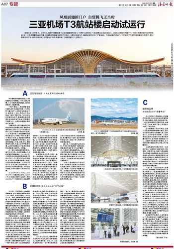 南海之滨,门户新开。2月1日,海南机场集团旗下三亚凤凰国际机场(以下简称三亚机场)T3航站楼正式启动试运行。这座以《诗经》“凤凰于飞”为设计灵魂的现代化空港枢纽,如一只昂首展翼的金色凤凰,在海南自贸港建设的时代长卷上,勾勒出连接内外、融通全球的空中门户新坐标。T3航站楼的试运行,不仅实现了三亚机场保障能力的提升,更以物理空间扩容、服务效能升级、开放载体扩容的多重突破,为海南民航注入空港动力。A