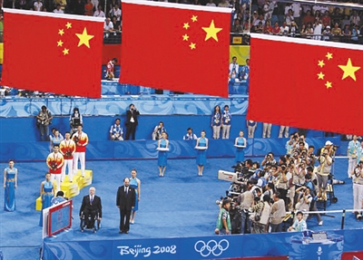 2008年8月23日,三面五星红旗在北京大学体育馆升起,中国选手马琳、王皓、王励勤在北京奥运会乒乓球男子单打比赛中分获金、银、铜牌。新华社发
