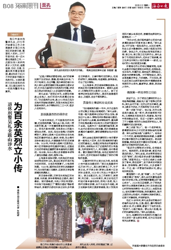 海口市退休刑警吴礼全,2013年开始便在工作之余搜集家乡海口长流地区的族谱文献,整理名人资料。2017年退休后,他一边从事法律服务工作,一边更加深入地研究家乡人文历史,涵盖祖源、古村、古建、古墓和英烈事迹等层面,最近形成了近20万字的首部书稿《长流英烈》。从其执着的行动和呈现的成果,可以窥见他作为一名前刑警的专业素养。