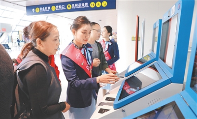 2月2日,2026年春运正式拉开大幕,为期40天的客流运输保障工作全面启动。作为琼州海峡核心交通枢纽,海口新海港提前部署、全力备战,确保春运运输秩序平稳有序。图为新海港自助售票机前,工作人员指导旅客购票。海南日报全媒体记者 邱肖帅 摄(相关报道见A03版)