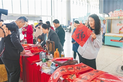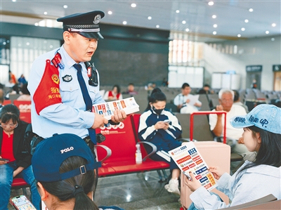 ③ 在海口东站候车大厅,民警宣传安全知识。