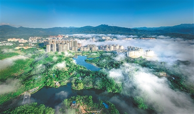 航拍青山环抱中的保亭。
