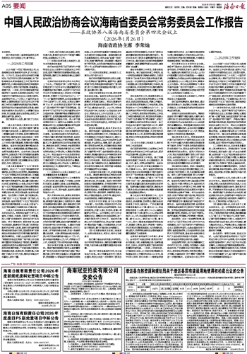 2026年是“十五五”开局之年,也是海南自由贸易港全面实施封关运作开局之年。省政协工作总体要求是:坚持以习近平新时代中国特色社会主义思想为指导,全面贯彻落实中共二十大和二十届历次全会精神,深入贯彻习近平总书记关于加强和改进人民政协工作的重要思想、习近平总书记关于海南工作的系列重要讲话和指示批示精神,紧紧围绕“三区一中心”的战略定位,锚定“把海南自由贸易港打造成为引领我国新时代对外开放的重要门户”战略目标,更好发挥专门协商机构作用,积极建言资政,广泛凝聚共识,努力为我省实现“十五五”良好开局、高标准建设海南自由贸易港作出政协贡献。