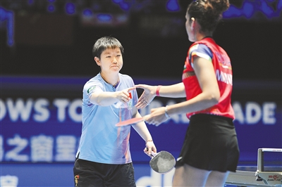 孙颖莎(左)以3比0战胜印度选手巴特拉。图为孙颖莎和对手握手。