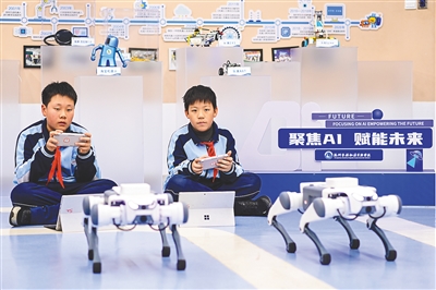 杭州市保俶塔实验学校的学生在人工智能通识课上学习如何给机器狗编程。