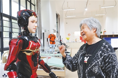 在深圳市养老护理院,一名老人与人形机器人互动。本栏图片均由新华社发