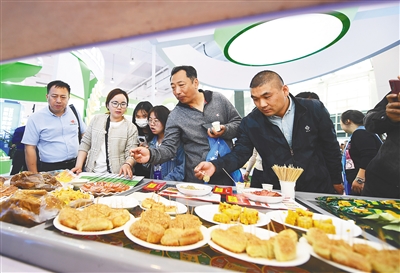 在河南中原农谷预制菜国际博览会上,参观者品尝加工好的预制食品。新华社发