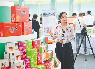 一名网络主播在首届宁夏重点预制菜推介展销会上介绍产品。新华社发
