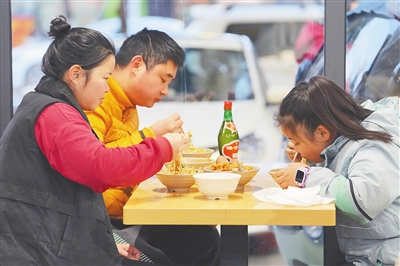 在四川省广元市一家凉面馆,一家三口在吃凉面。