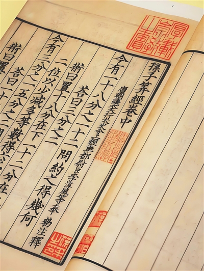 直到清代乾隆年间编纂《四库全书》,在官方和民间的反复搜寻下,最终找到《周髀算经》《九章算经》《孙子算经》《五曹算经》《张丘建算经》《夏侯阳算经》《数术记遗》七种南宋刻本。之后,这七部书被收入《四库全书》,而原刻本发还民间后,《夏侯阳算经》再次不知去向,其余六种则经历代藏书家收藏流传至今。