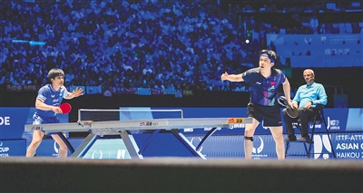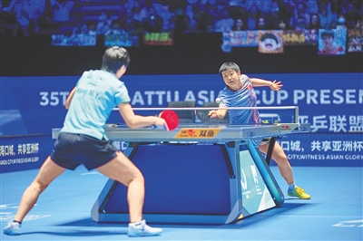 在第三十五届国际乒联-亚乒联盟亚洲杯女单决赛中,孙颖莎(右)和王曼昱在对决。