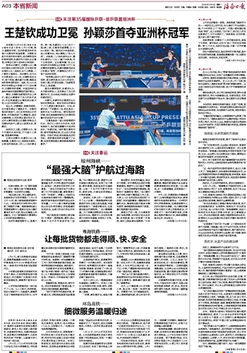 本报海口2月8日讯(海南日报全媒体记者习霁鸿)2月8日晚,第35届国际乒联-亚乒联盟亚洲杯在海口五源河体育馆落幕。王楚钦击败日本选手张本智和,成功蝉联亚洲杯男单冠军;孙颖莎则力克队友王曼昱,夺得自己首个亚洲杯女单冠军。男单半决赛中,王楚钦4比0横扫中国台北选手张佑安,日本选手张本智和4比1战胜队友户上隼辅,二人锁定三强席位。在决赛中,双方比分交替战至2比2后,王楚钦坚定出手,连下两城,最终赢下比赛,捧起亚洲杯男单冠军奖杯。此前,在2025世界乒乓球职业大联盟(WTT)总决赛中,王楚钦因伤退赛。本届亚洲杯也是他伤愈后在国际赛场的首次复出。