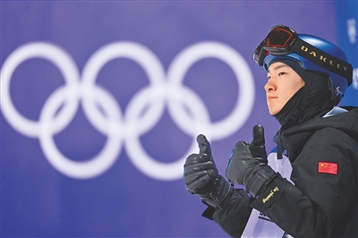 2月7日,中国选手苏翊鸣在第二跳后比出了大拇指。 新华社发