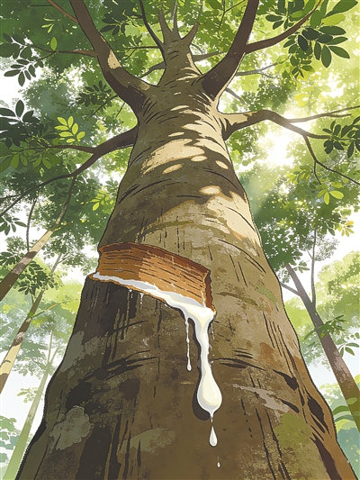 在热带植物中,橡胶树尤为独特。它虽不属于严格意义上的树脂植物,但是受伤后也会流出“眼泪”。在橡胶树原产地亚马逊流域,土著语将橡胶树称为“caoutchouc”(意为“流泪的树”),这个名字生动捕捉到橡胶树流淌出白色乳胶的自然景象,也隐喻着橡胶生命的坚韧与细腻。