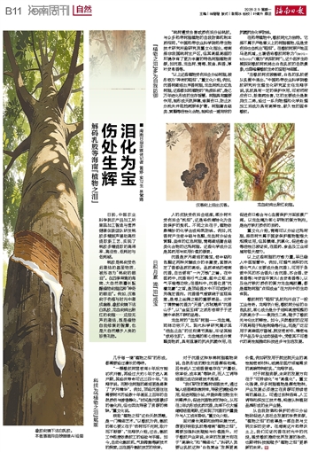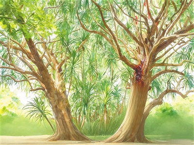 桃胶是桃树受伤后凝结的晶莹物质,被形容为“桃树的眼泪”。在四季常青的海南,大自然很擅长酝酿植物树脂这种“神奇的眼泪”。例如,沉香树于伤痕与时光中凝成幽香,橡胶树滴下洁白乳胶,龙血树淌出殷红的树脂……这些无声的凝结,既是植物自我修复的智慧,也是大自然赠予人类的珍贵礼物。