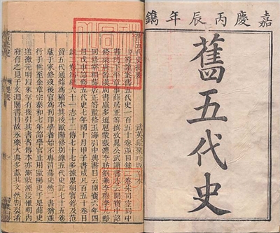 北宋薛居正监修、卢多逊等同修,清代嘉庆元年重刊的《旧五代史》(原名《五代史》,又名《梁唐晋汉周书》)扉页。