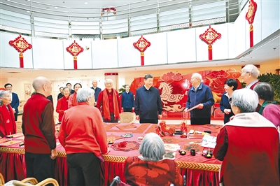 在银龄老年公寓,习近平详细了解老年人健康检查、康复训练、日常起居照料等情况。大厅里,一些老人正在写春联和福字,习近平来到他们中间,欣赏他们的创作,勉励他们老骥伏枥、老有所为,祝他们健康长寿、春节快乐。