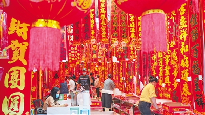 近日,海口博爱路年货一条街喜庆祥和,众多市民游客前来选购年货。