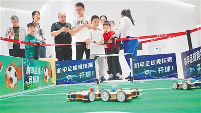 转角处,超级马力竞技赛早已人气爆棚。孩子们紧握操控手柄,指尖在按键上飞快滑动,全神贯注地指挥着巴掌大的小型竞技机器人冲刺、射门,感受机械传动、实时操控与团队协作的乐趣。在工作人员的引导下,大家从“看科学”变成“玩科学”,沉浸式了解机器人与人工智能。