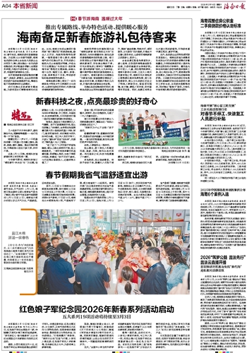 据悉,从即日起至正月十五,红色娘子军纪念园将陆续推出游园打卡有礼、非遗迎春体验、红色主题互动、文化演艺、元宵节活动等五大系列19项特色活动,包括琼海非遗美食体验、黎族苗族文化特色体验、马年游园会、“打倒南霸天”保龄球、“南府大出逃”巨型飞行棋、小琼花人偶巡游、红色娘子军后人讲故事等,在传承红色文化中,为游客奉上新春祝福。