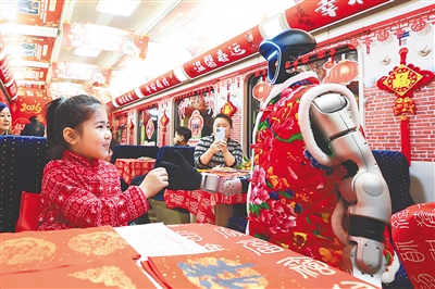 2月13日,在黑龙江齐齐哈尔开往北京的T48次列车上,哈尔滨铁路部门连续二十年举办的列车“春晚”如约而至。在多样的节目中,两个仿生机器人成为全场焦点,旅客沉浸在列车“春晚”温馨氛围的同时,也感受到了年味中满满的科技感。
